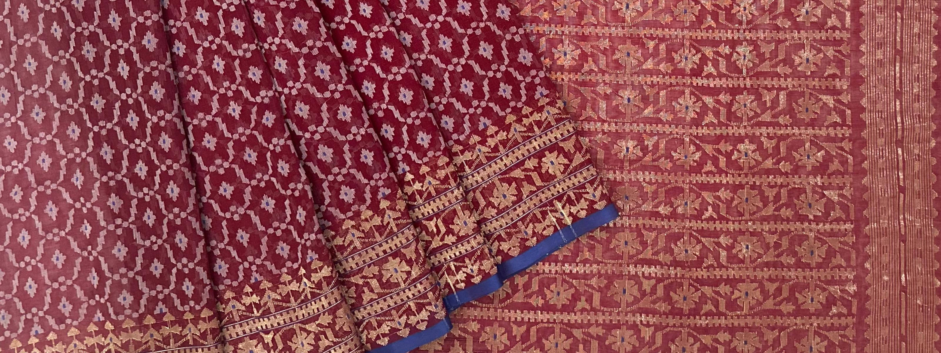 Dark Red with Golden and White Jaal Dhakai Jamdani